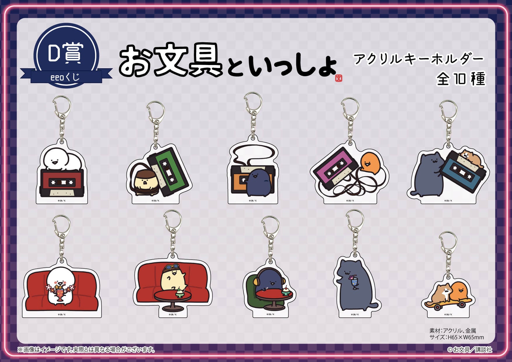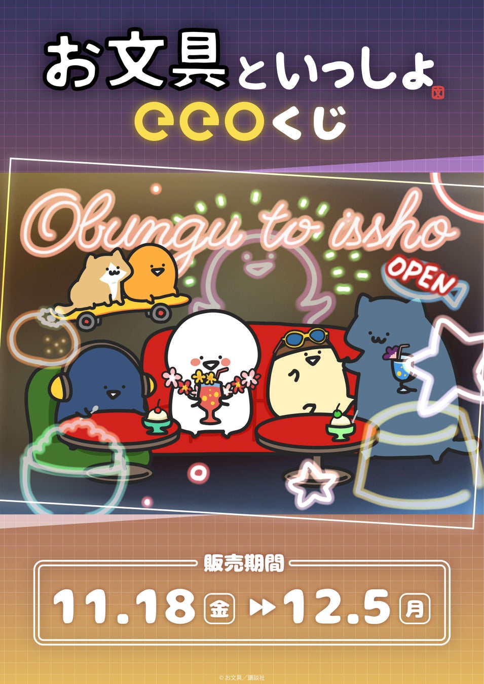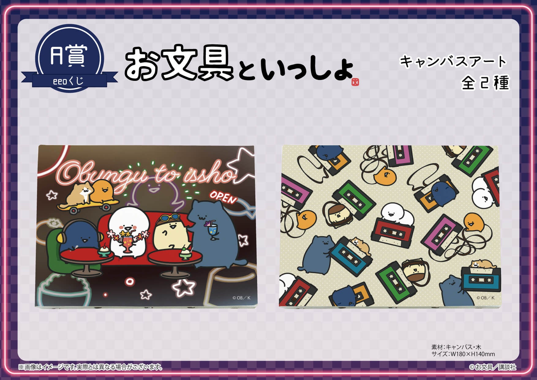 今回の「eeoくじ」の景品には、お文具さんやプリンさんたちとともにネオンやカセットが描かれた、どこか懐かしいテーマの描き下ろしイラストを使用しています。この機会をどうぞお見逃しなく!