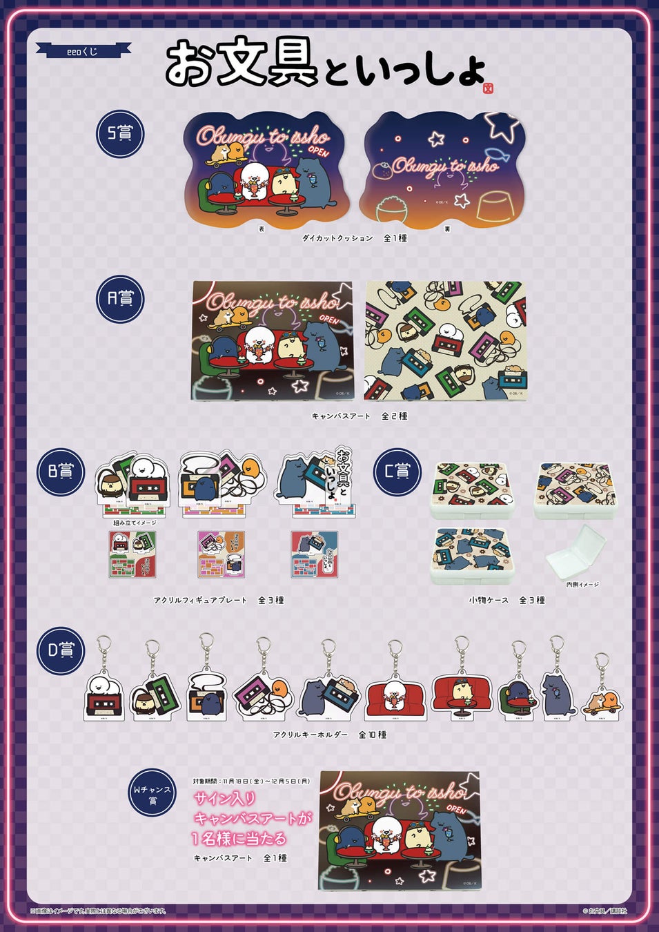 描き下ろしイラストを使用した新作グッズが豪華景品で当たる、『お文具といっしょ』のオンラインくじ「eeoくじ」が登場! 11月18日~12月5日の期間限定でeeo Store(通販)にて発売されます。