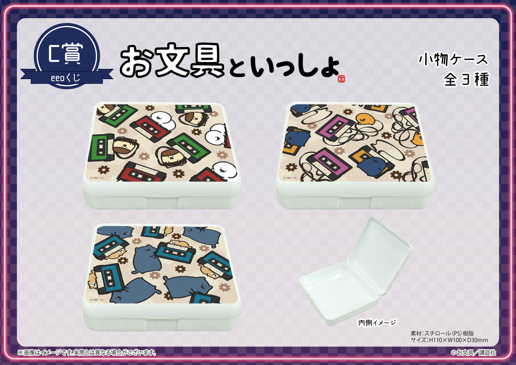 小物ケースのサイズはおよそ縦100×横110×深さ30mmで、アクセサリーやイヤホンなどを収納するケースとしてお使いいただけます。カセットテープを伸ばしたり絡まったり……思い思いに遊ぶお文具さんたちがとってもキュート♪ ぜひGETしてくださいね。
