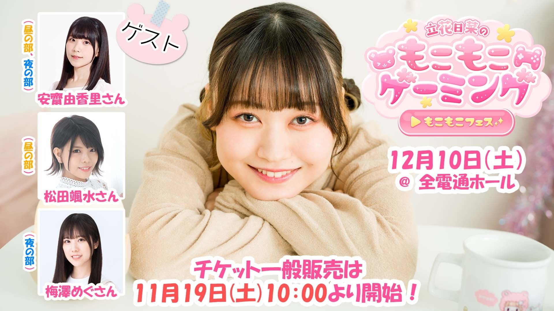 OPENREC.tvで配信中のゲームバラエティー番組『立花日菜のもこもこゲーミング』(もこげー)初リアルイベント12月10日(土)に開催! 一般チケットの販売が11月19日(土)10:00よりスタート。イベント当日は出演キャストがパジャマ姿を披露!