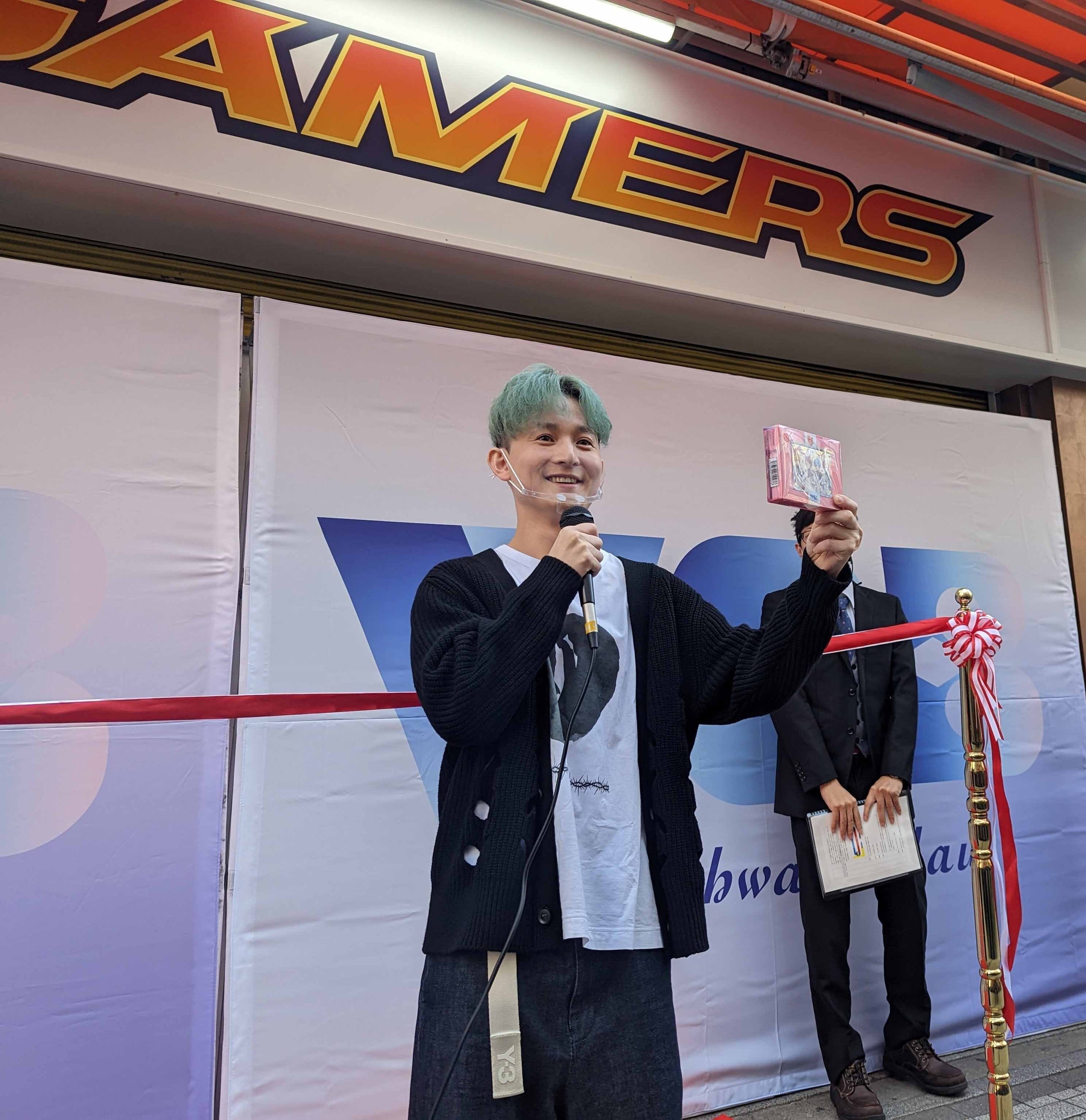セレモニーは発売記念のテープカットからスタートし、トークセッションでは『from ARGONAVIS』七星 蓮役の伊藤昌弘さんと『ヴァイスシュヴァルツブラウ』開発担当者である金谷プロデューサーが新商品や『ヴァイスシュヴァルツブラウ』の今後の展開について語りました。