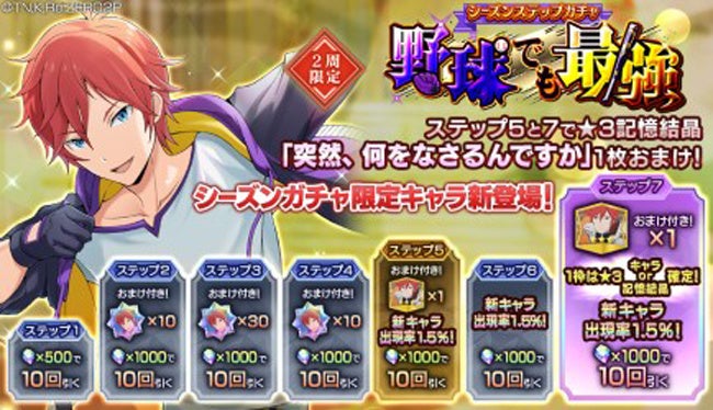 内容:期間中、2周限定で引くことができる、「シーズンステップガチャ【野球でも最強】」を開催します。