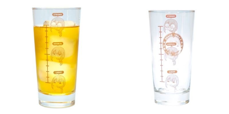 お酒などを割るときの目安になるメモリは鳥羽先生の酔っ払い具合をかわいいイラストにしました。