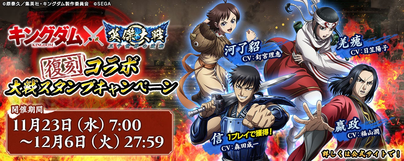 株式会社セガは、現在稼働中のアミューズメント施設向け対戦型カードアクションゲーム『英傑大戦 三千世界の波動』(以下、英傑大戦)において、TVアニメ『キングダム』との復刻コラボイベントを2022年11月23日(水・祝)より開催いたします。