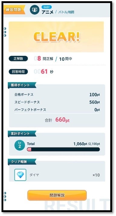 練習問題をクリアしたスピードや正解率に応じて、ポイントやダイヤを獲得できます。