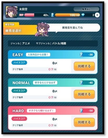 難易度は、EASY、NORMAL、HARDの3つ。それぞれ時間内に既定の問題数をクリアすると、ポイントやダイヤといったアイテムを獲得できます。