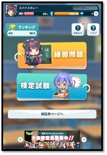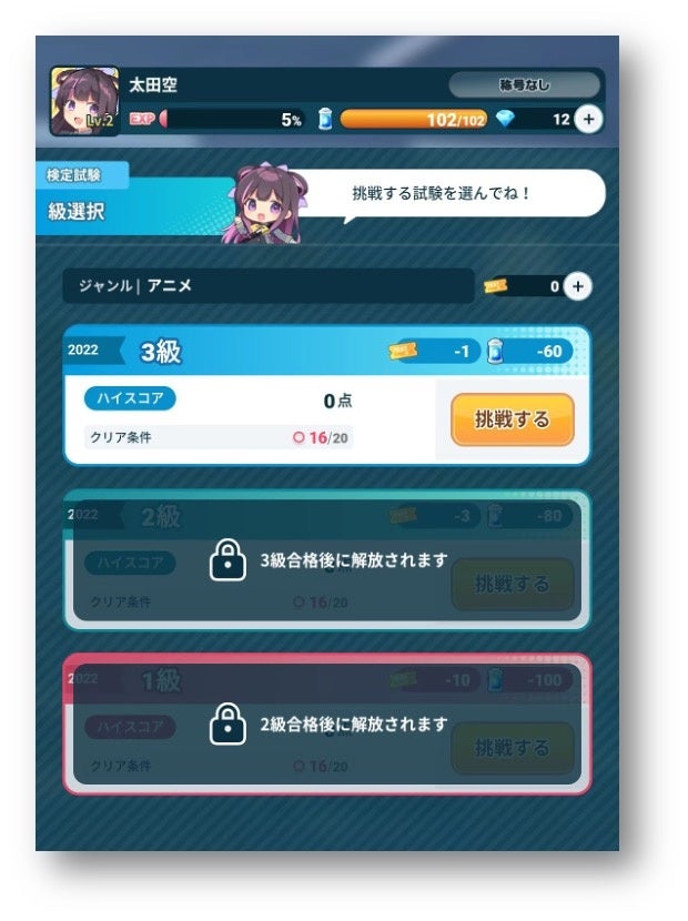 ダイヤを集めたら「検定試験」に挑戦!「検定試験」に合格すると、難易度に応じた「合格証」がゲーム内で授与されます。