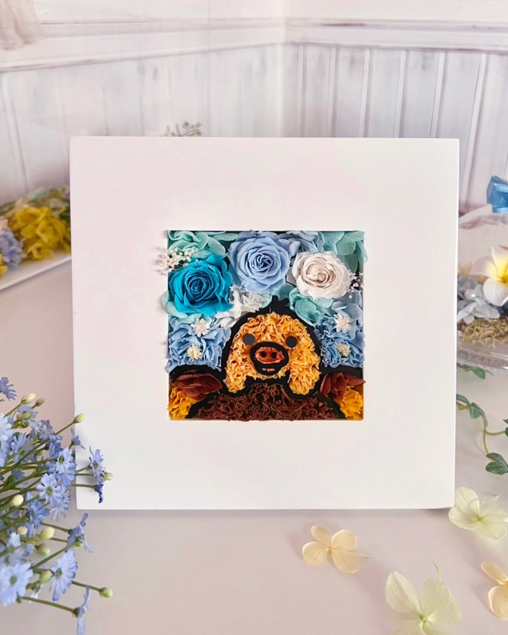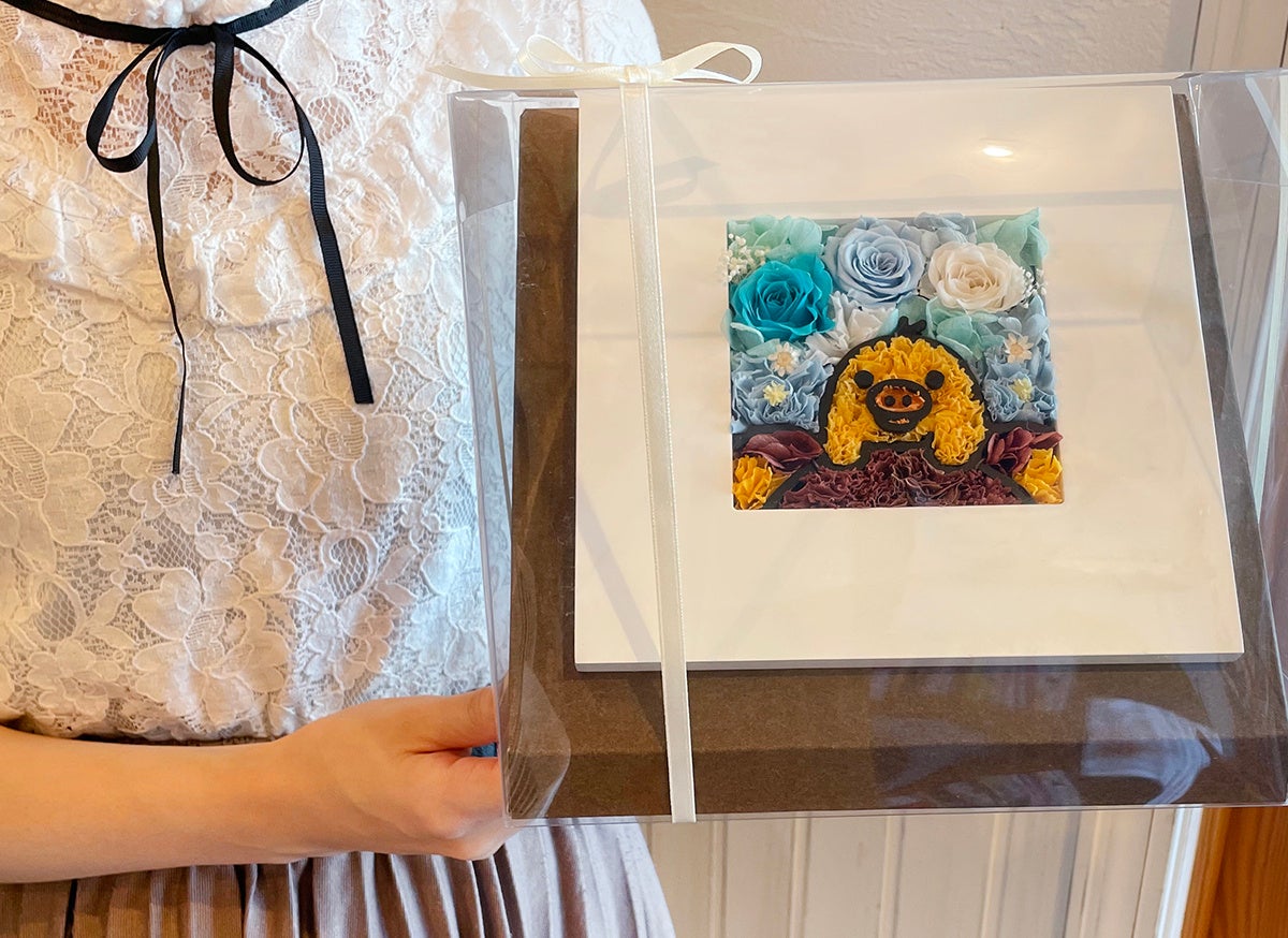 「キイロイトリのお花畑」は、かわいいキイロイトリを立体的にお花で描いたとってもキュートなフラワーBOX。バラやあじさいのプリザーブドフラワーに囲まれてうれしそうなキイロイトリは、黄色いカーネーションを組み合わせて表現。おもわず頭をなでたくなるかわいさです。