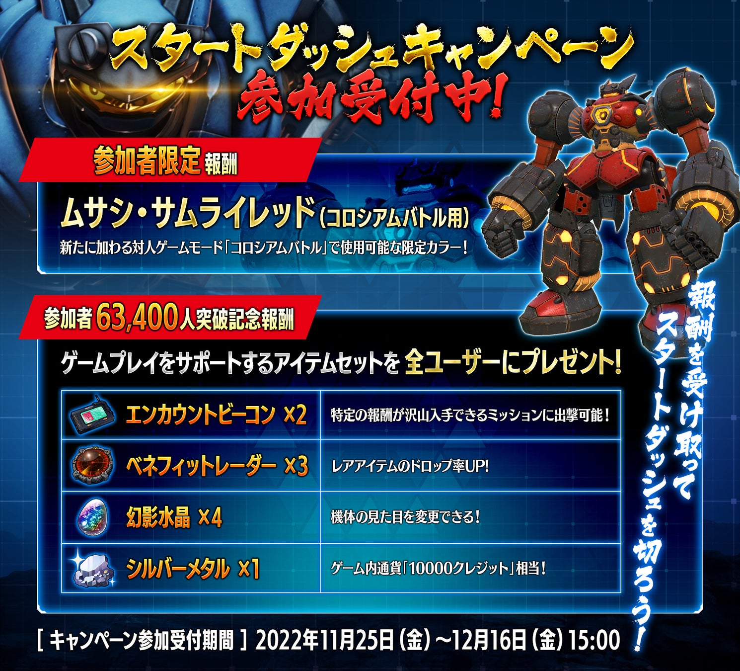 - スタートダッシュキャンペーン始動!参加者限定報酬に加え、参加者数63,400人突破で全員にゲーム内アイテムをプレゼント!