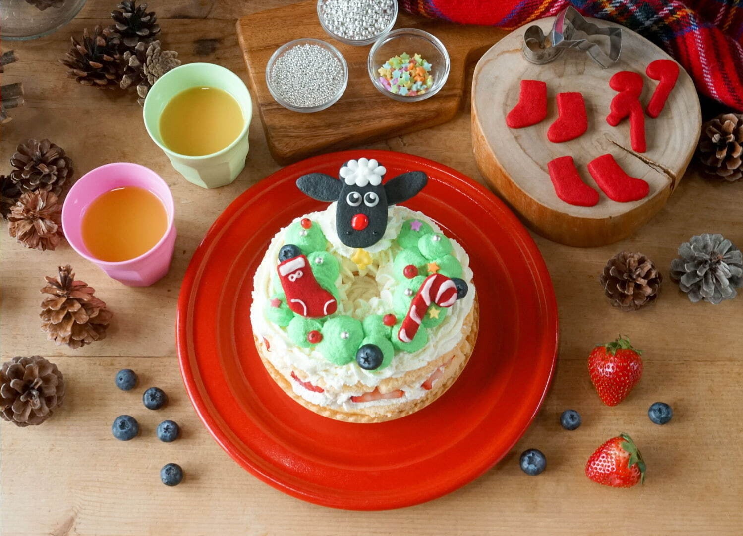 カスタードタルトにデコレーションして、ショーンのクリスマスリースケーキを作ります。パティシエ気分で生クリームを絞ったり、自家製クッキーやいちご、ブルーベリーなどを自由に飾り付け。お持ち帰り限定となります。※写真はイメージです