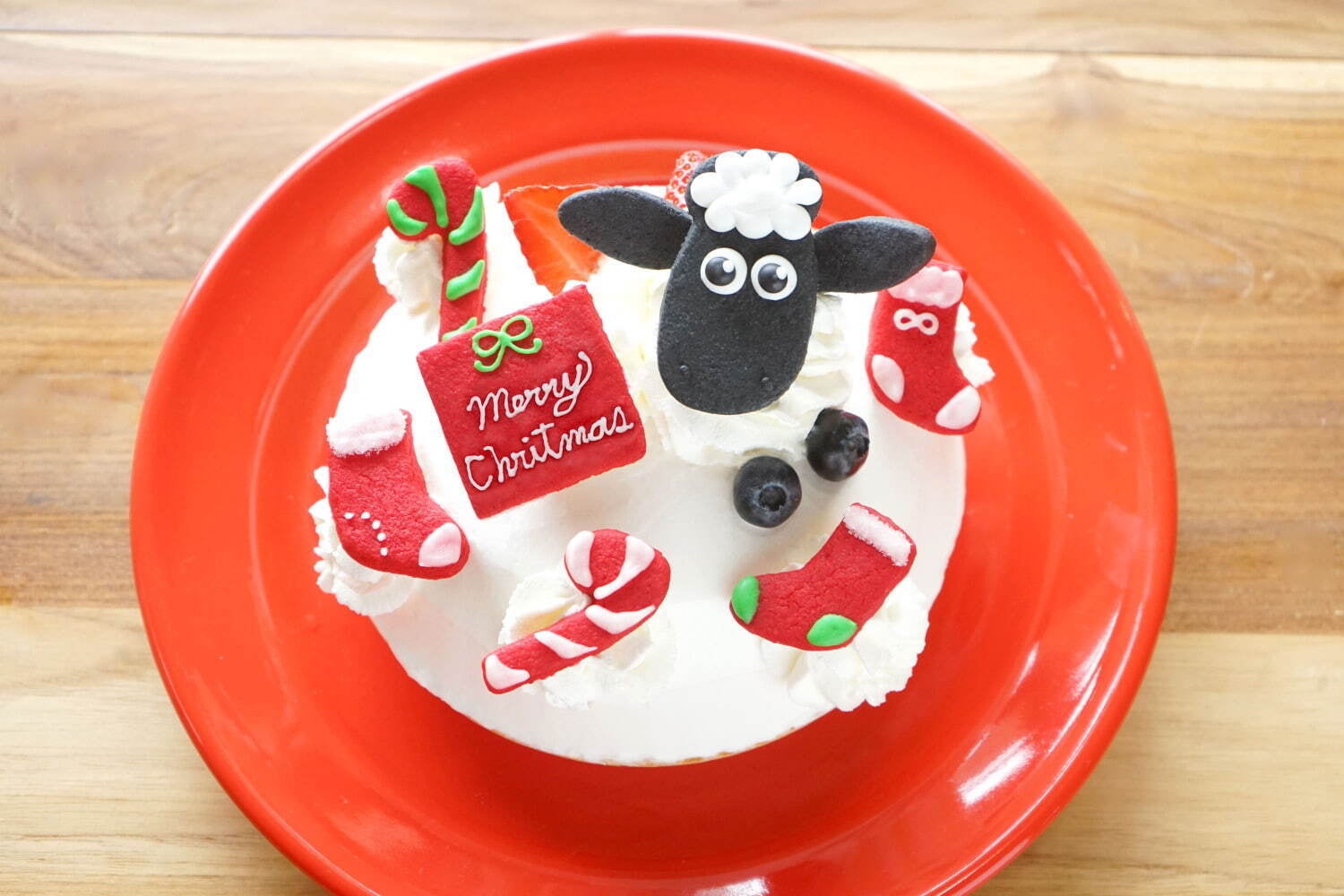 賑やかな赤いクリスマスアイテムとショーン。しっとりふわふわのスポンジにいちごやクリームをサンドした、タルトタイプのショートケーキです。クリスマスディナーのお楽しみデザートにぜひ。