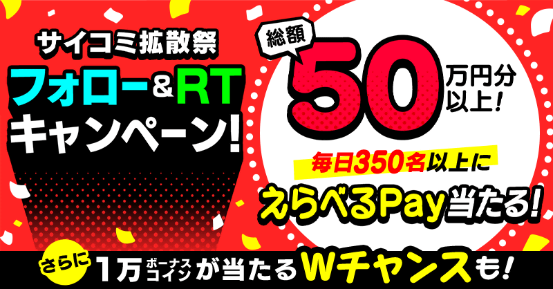 「サイコミ」公式Twitterアカウント(@cycomi)をフォローのうえ、「サイコミ」公式から発信されるおすすめ作品のツイートをリツイートし、アプリ内の抽選ページにアクセス!毎日350名以上にえらべるPayが抽選で当たります。総額50万円分以上!対象ツイートは日替わりで14作品です。