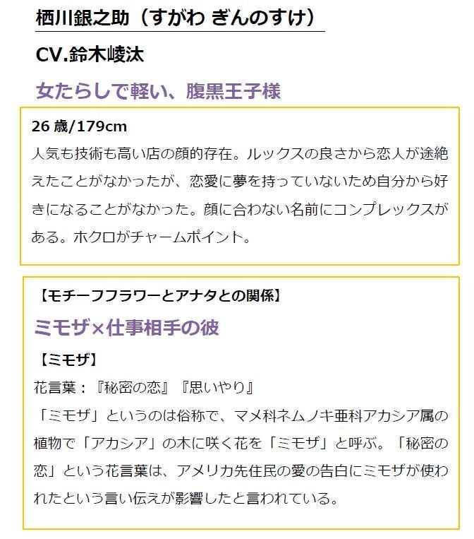 本作は、『花が繋ぐ4つの恋物語』をテーマにフラワーショップで働く彼と恋人であるアナタとの恋愛模様が、花にまつわるエピソードと共に描かれます。キャラクターごとに異なる4つの花がモチーフとなり、それぞれ後輩、仕事相手、幼なじみ、同級生の関係から物語を展開! 心癒されるひとときをお届けします。
