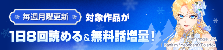 概要:12月の毎週月曜日に対象の人気SMARTOON作品が通常23時間ごとに1話読める「待てば¥0」システムのチャージ時間がなんと3時間で1話読むことができます。