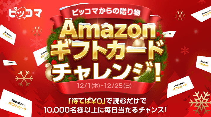 今回のイベントではピッコマをご利用頂いてる方、初めてご利用される方両方が楽しめるように様々なイベント・特典をご用意いたしました。中でも目玉となるのが、ピッコマで作品を1話「待てば¥0®︎」で読むだけで毎日Amazon ギフトカードやお得に作品が読めるアイテムがもらえる「Amazonギフトカードチャレンジ」です。12/24, 25には100万円分のAmazon ギフトカードが当たるチャンスもございますので、こちらも是非ご参加ください。「待てば¥0」は23時間待てば1話、指定範囲の話が無料で読める機能です。
