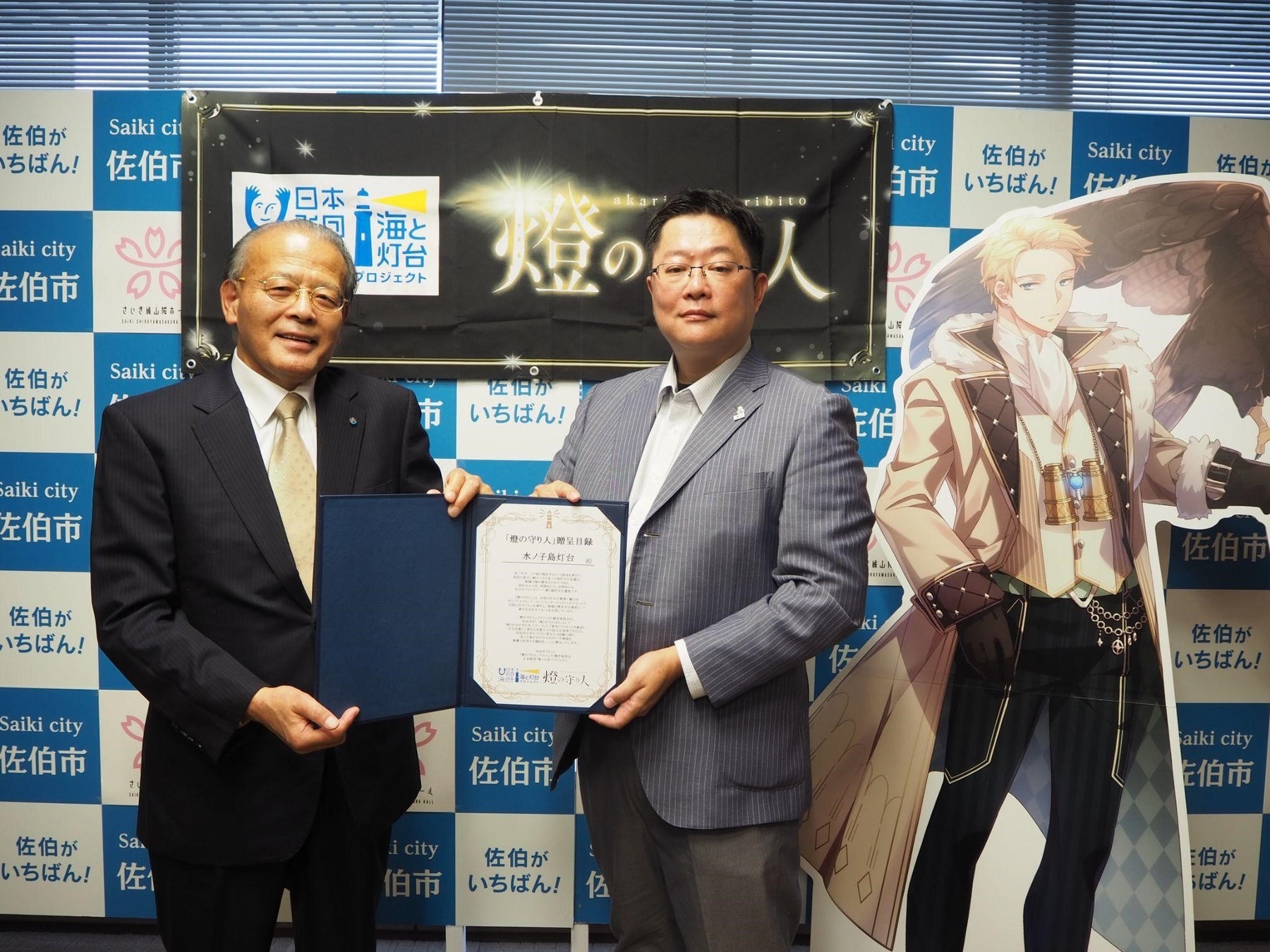 燈の守り人キャラクターを活用して、地域の灯台を歴史・文化資産として活用する機運をつくるため、キャラクター化の対象となる「水ノ子島灯台」が立地している大分県佐伯市の田中利明市長を、「燈の守り人」製作委員会プロデューサーの柴田英知が2022年11月28日(月)に表敬訪問し、キャラクターの贈呈式を実施しました。