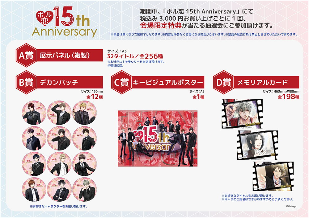 グッズでは、現在配信中の人気作品のほか、10年以上愛されているボル恋作品もグッズ化!豊富なラインナップをご用意しました。さらに、税込み3,000円以上お買い上げごとに参加できる抽選会では、描き下ろしキービジュアルを使ったアイテムだけでなく、会場展示イラストから選べる複製パネルやメモリアルカードなど15周年ならではの特典も充実しております。