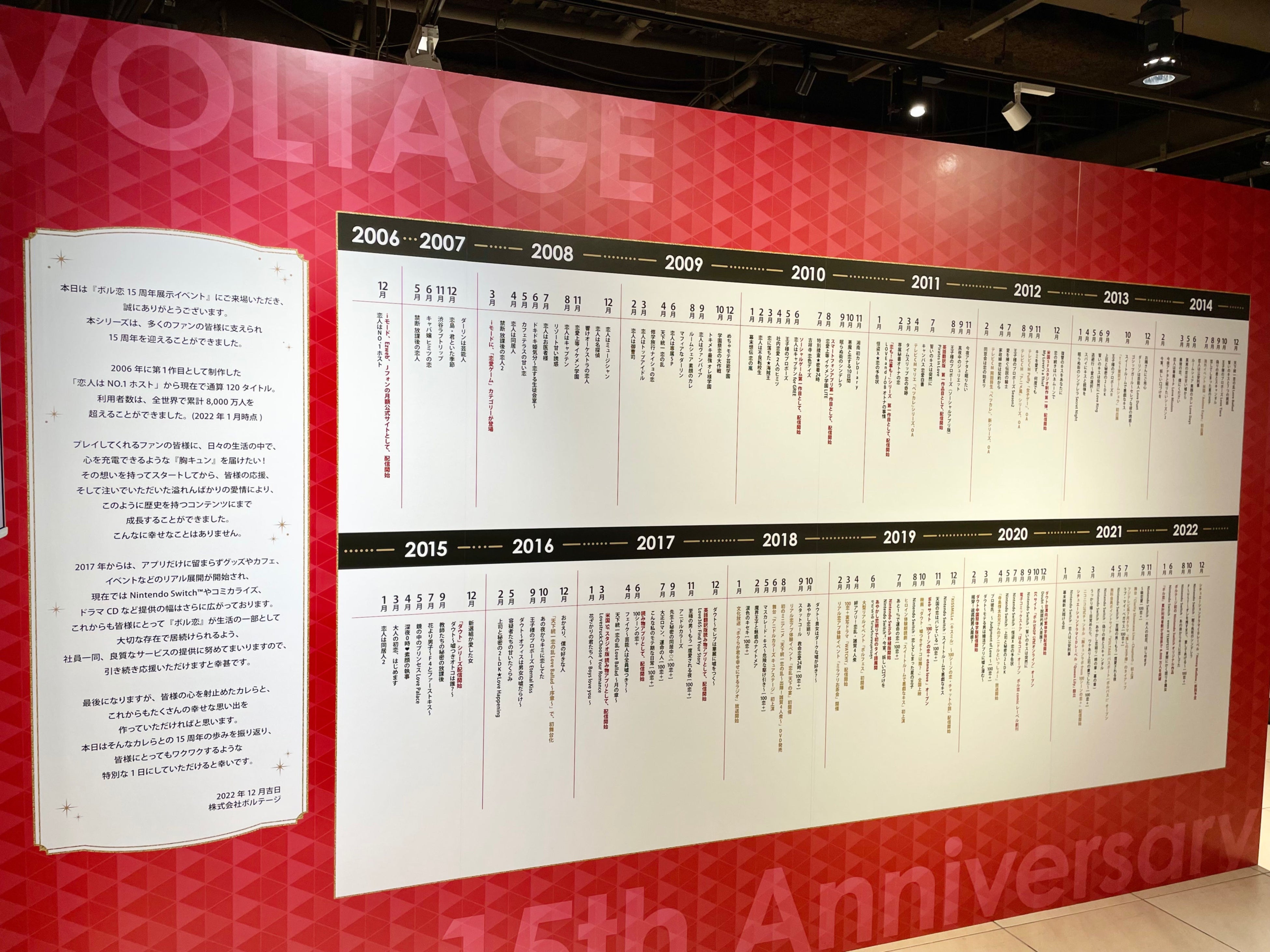 会場入り口では特大の描き下ろしキービジュアルが皆様をお出迎えしており、一歩中に入ると、メッセージやボル恋の歴史をまとめた年表がお目見え。