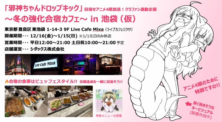 また、このプロジェクトの併設企画として、池袋でコラボカフェ「4期に向けて強化合宿ですの(仮)」を開催します。強化合宿の名にふさわしい企画・飲食を楽しめるほか、リアルタイムにプロジェクトの進捗を共有します。