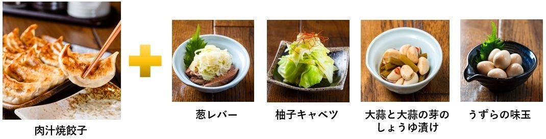 メインディッシュの「肉汁焼餃子」と、「葱レバー」「柚子キャベツ」「大蒜と大蒜の芽のしょうゆ漬け」「うずらの味玉」のうちの2品をご自由に選んでいただけます。