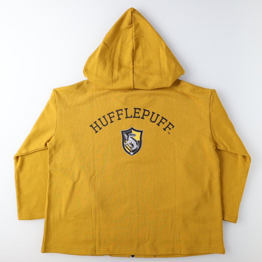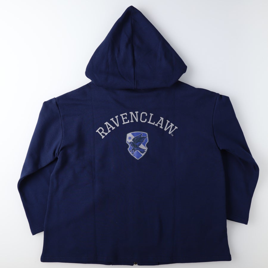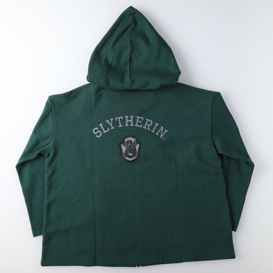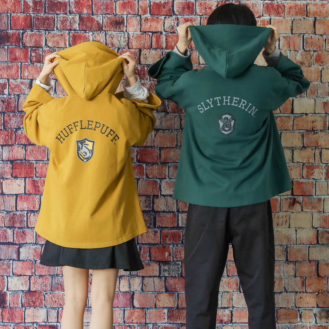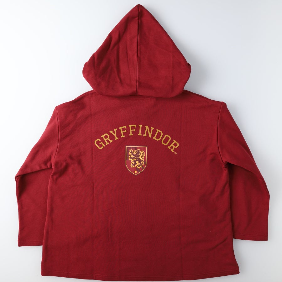 映画『ハリー・ポッター』シリーズの作中で、クィディッチの試合中に着用しているクィディッチローブをイメージした、ローブパーカーが登場します。グリフィンドール、スリザリン、レイブンクロー、ハッフルパフの各寮のイメージカラーを上品で落ち着いた色味で表現し、ローブの様に広がった袖口が華やかさを演出いたします。フード部分は、作中に登場するクィディッチローブをイメージした三角の形で、胸元と背中に各寮の紋章がプリントされています。ユニセックスで着用できる大きめのフリーサイズで、上下から開閉可能なダブルジップ仕様のため、ポンチョの様に羽織ったりと、さまざまなコーデをお楽しみいただけます。