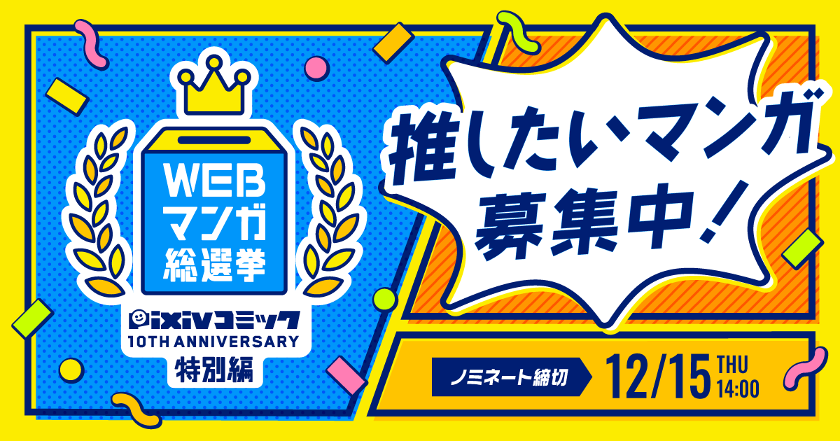ピクシブ株式会社(本社:東京都渋谷区、代表取締役:國枝 信吾、以下ピクシブ)は、日本出版販売株式会社(本社:東京都千代田区、代表取締役社長:奥村 景二)と協同し、WebマンガNo.1を決める大型投票イベント「WEBマンガ総選挙 pixivコミック10周年 特別編」ノミネート候補作品の募集を2022年12月8日(木)より開始します。