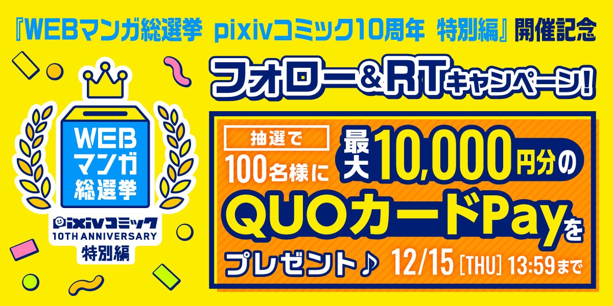 「WEBマンガ総選挙 pixivコミック10周年 特別編」の開催を記念し、期間中にpixivコミック公式Twitter(https://twitter.com/pixivcomic)をフォローし、対象ツイートをリツイートした方の中から抽選で100名様にQUOカードPayをプレゼントします。