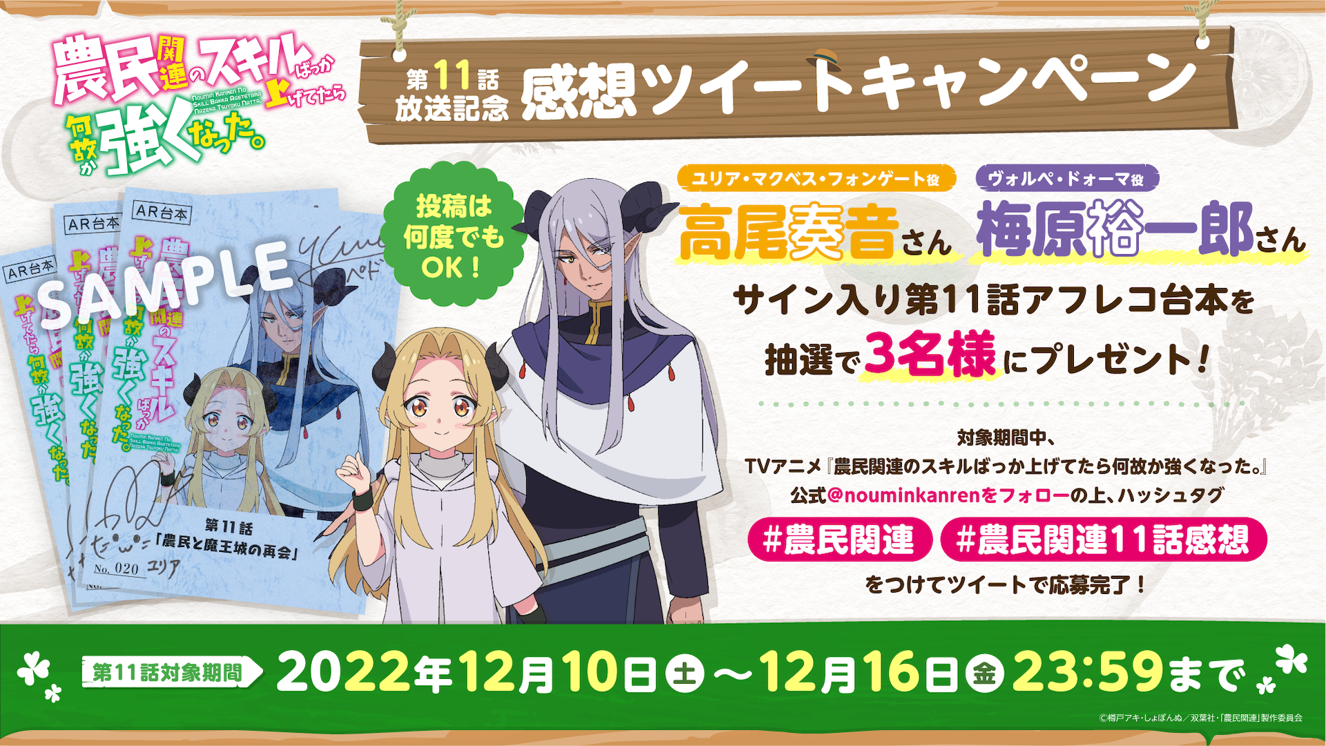 - TVアニメ『農民関連のスキルばっか上げてたら何故か強くなった。』 第11話放送記念 感想ツイートキャンペーン
