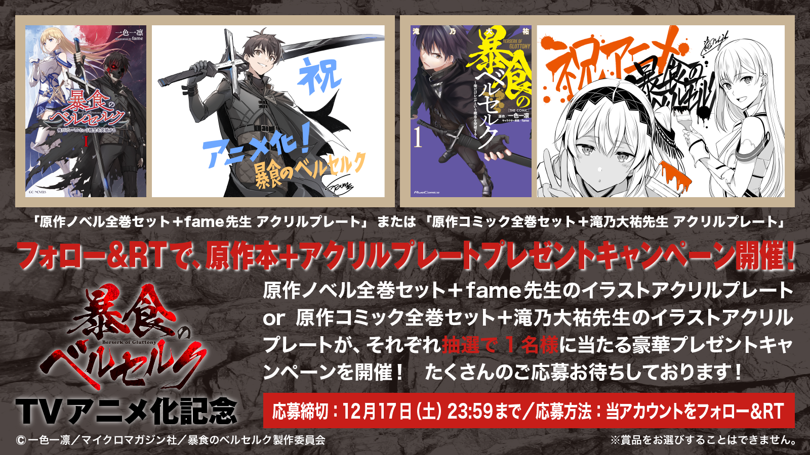・TVアニメ『暴食のベルセルク』公式Twitterアカウントにてプレゼントキャンペーンを開催