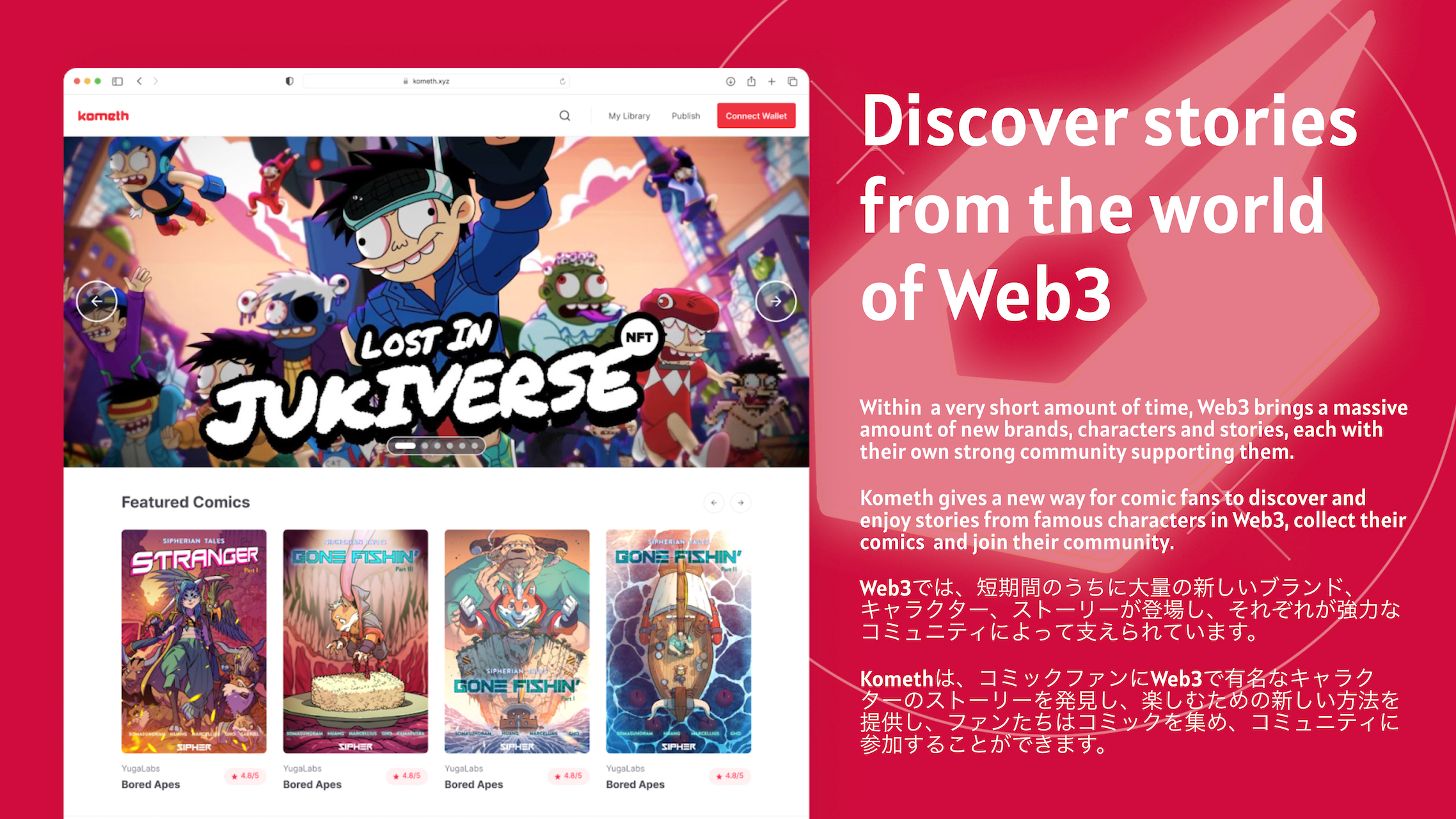 カルチャーウィーヴァー合同会社(本社:東京都豊島区、代表:平柳竜樹)は、インドネシア発のスタートアップ企業であるGASPACK社(https://www.gaspack.xyz/)と協業し、同社が運営するNFTコミック・プラットフォーム「Kometh」について、日本を含む世界展開をサポートします。協業開始を記念して、2022年12月13日・14日に開催される「NFTサミット東京」(会場:東京都立産業貿易センター浜松町館)に参加し、「東南アジアにおけるNFT」や「マンガとNFT」をテーマにトークセッションを行います。