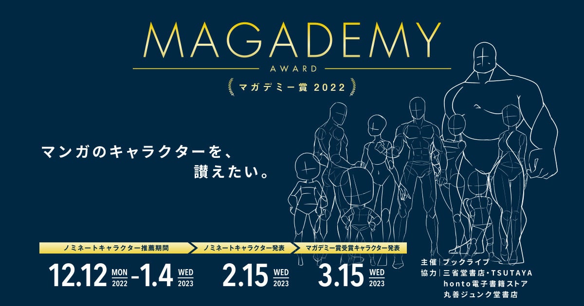 凸版印刷株式会社のグループ会社である、株式会社BookLive(本社:東京都港区・代表取締役社長:淡野 正)は、業界初の”マンガのキャラクター”を讃えるマンガのアワード「マガデミー賞2022」を開催いたします。推薦期間は2022年12月12日(月)~2023年1月4日(水)、ノミネートキャラクターの発表は2023年2月、マガデミー賞の発表は2023年3月を予定しています。