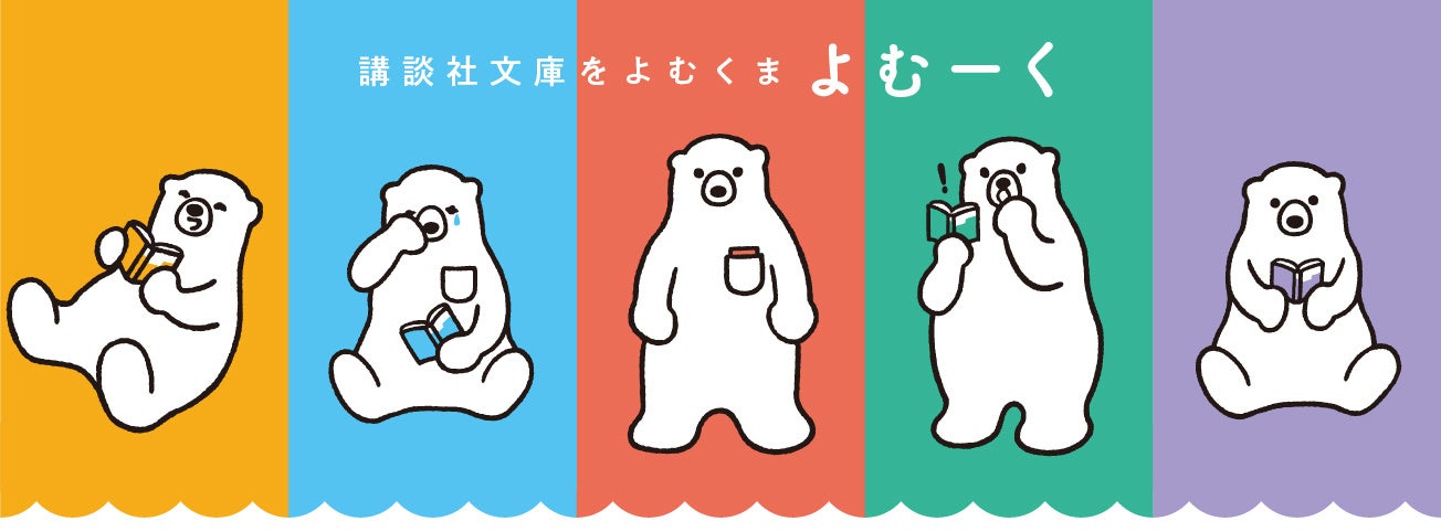 Suicaのペンギンやチーバくんなど、数多くのキャラクターを手がける大人気のイラストレーター・坂崎千春さんが描かれたよむーくは、カラフルなカバーの講談社文庫が大好きで、胸ポケットに大切な本をいつも入れているシロクマです。