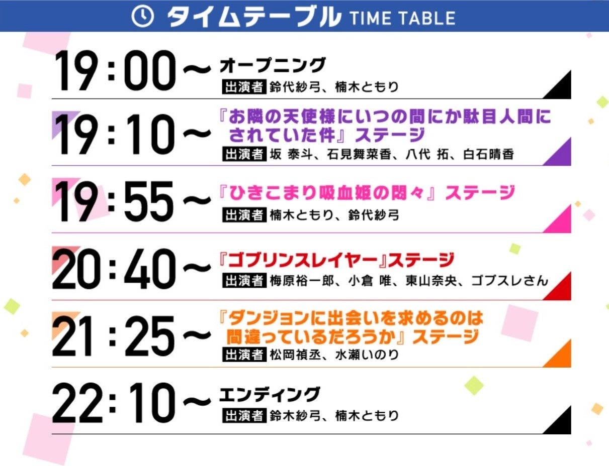 2013年の第1巻発売から10周年を迎える『ダンまち』のステージでは、本イベント直後からABEMAにて放映開始となる「ダンまちⅣ 深章 厄災篇」の最新情報をお届けします。このほか、1月7日よりTVアニメがスタートする『お隣の天使様にいつの間にか駄目人間にされていた件』、TVアニメシリーズ2期が現在制作中の『ゴブリンスレイヤー』などのステージでもサプライズ情報が満載です。アニメ・ドラマCD出演の声優陣が多数登場し、蔵出し情報と共にイベントを盛り上げます。