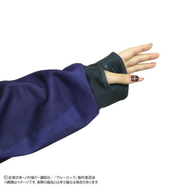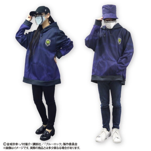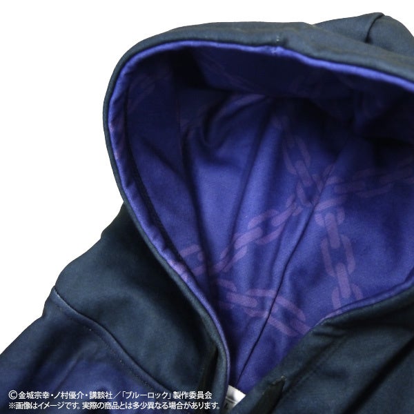 「パーカー」はボディスーツの柄をグラデーションでアレンジし、フードの内側にも作品を連想させるチェーンをデザインに取り入れたファッショナブルな仕上がり。胸元のブルーロックロゴも刺繍のワッペンで高級感を持たせました。トレンドのオーバーサイズで、さりげなく日常に取り入れられる一着です。
