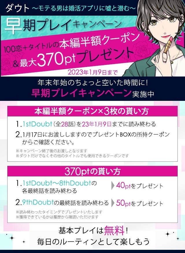 現在100恋+では、最新作の配信を記念して“本編半額クーポン”や“最大370pt”がもらえる早期プレイキャンペーンを実施中です。100恋+をお得に楽しめる機会となっておりますので、 「ダウト~モテる男は婚活アプリに嘘と潜む~」ならびに100恋+を存分にお楽しみください。