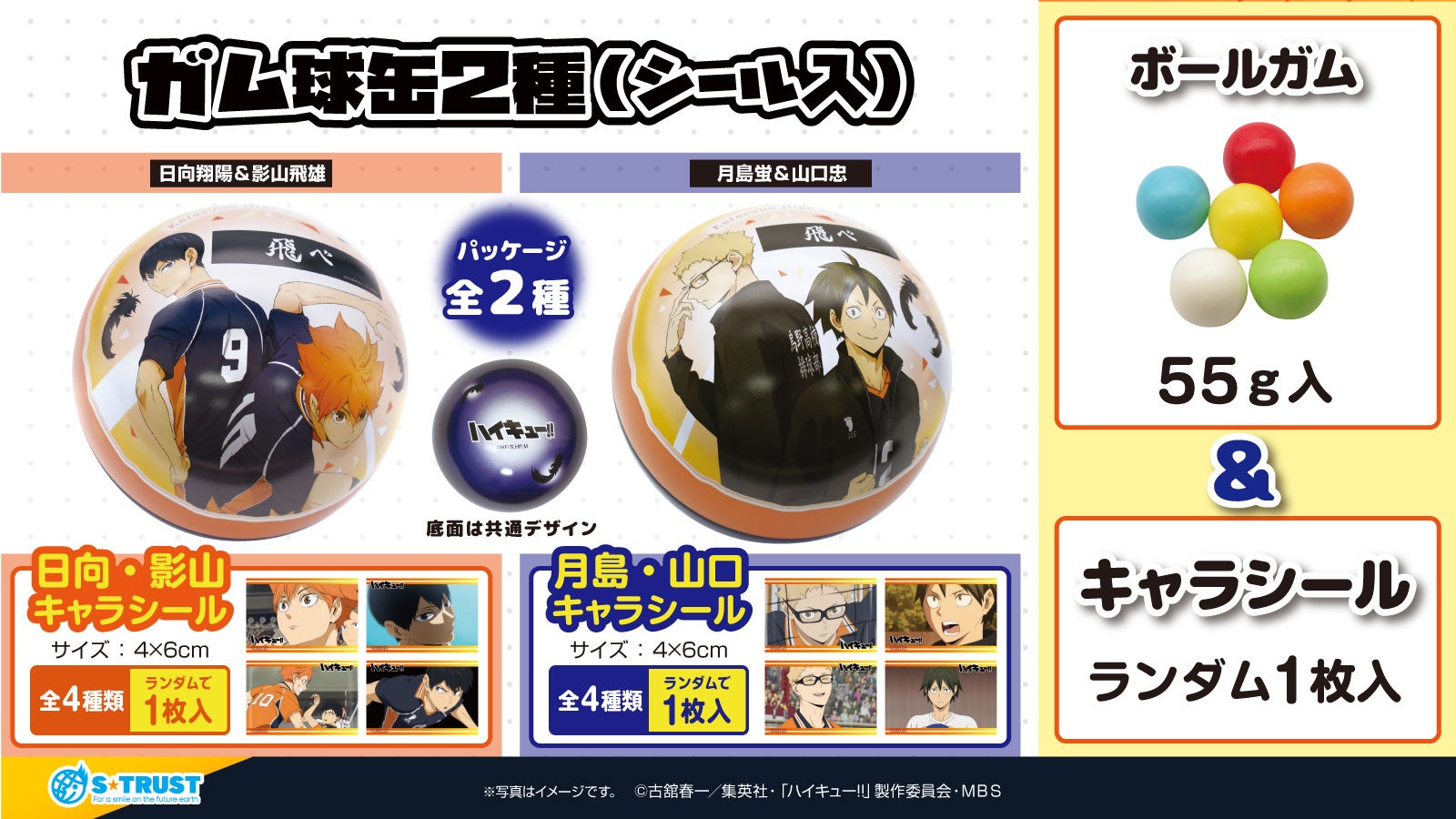 株式会社エス・トラスト(本社:大阪市西区、代表取締役:井田 金吾、以下 エス・トラスト)は、アニメ『ハイキュー!!』のアミューズメント専用景品(プライズ)第2弾となる、『ポップコーンBOX』『ガム球缶』『チョコサークルプラケース』を2023年1月中旬・下旬より全国のゲームセンター・オンラインクレーンゲームへ順次投入を予定しております。