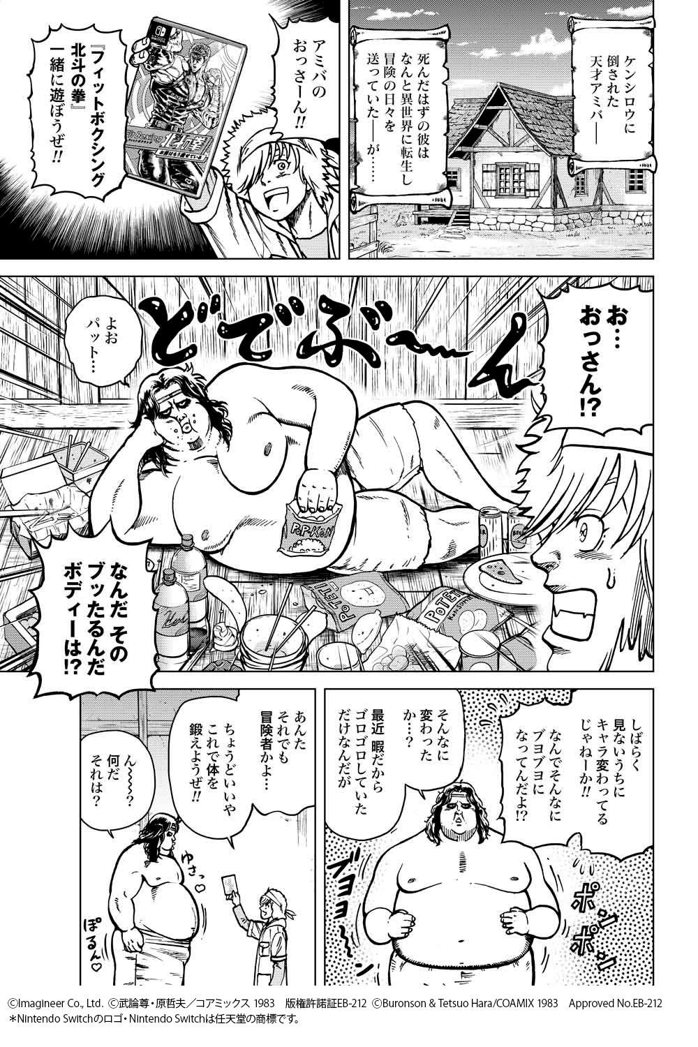 「北斗の拳外伝 天才アミバの異世界覇王伝説」は、月刊コミックゼノンで現在大人気連載中の「北斗の拳」スピンオフ作品ですが、「Fit Boxing 北斗の拳」発売となる本日、描き下ろしのコラボレーションマンガを公開します。異世界でぽっちゃりしてしまったアミバが「Fit Boxing 北斗の拳」でどう変わるのか!?全編は「Fit Boxing 北斗の拳」公式サイトよりご覧下さい。
