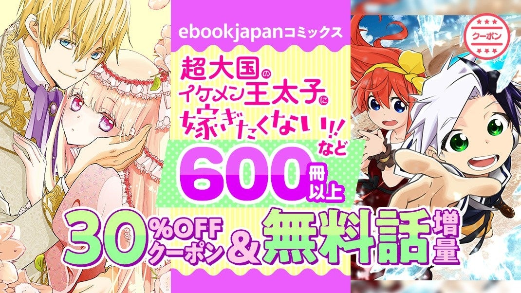 今キャンペーンは、オリジナルレーベル「ebookjapanコミックス」作品(12月発売の一部の話作品を除く)が対象。現在連載中の『超大国のイケメン王太子に嫁ぎたくない!!』や『貴族次男の成り上がり~魔法を極めて世界最強になった転生者~』『現代無双~異世界で魔法を覚えて、現代で無双する~』をはじめ、完結作『はじまらない結婚』『PTAのとも ヤンギャルママ春名さん参上!』、チャレンジ企画から連載化された『悪役令嬢、大好きな妹のためにその名を返上する』などの人気作に、30%OFFで購入できるクーポンをお付けいたします。