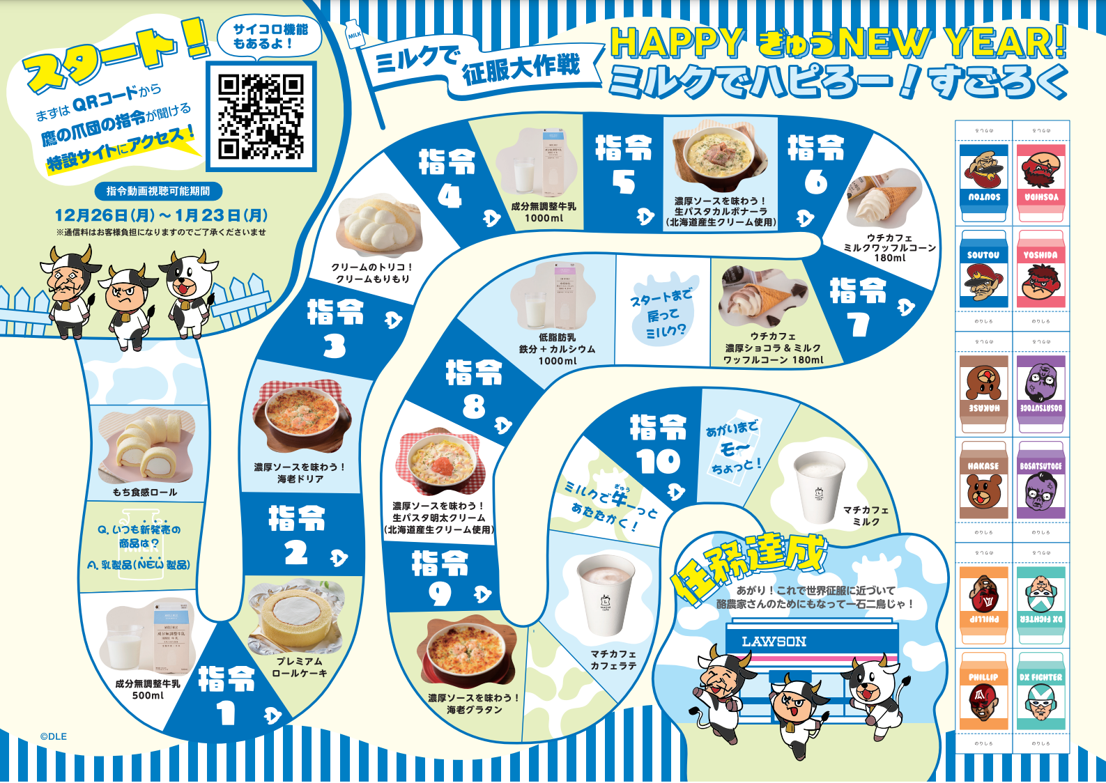 株式会社ディー・エル・イー(本社:東京都千代田区、代表取締役社長:小濵直人、以下DLE)は、株式会社ローソン(本社:東京都品川区、代表取締役 社長:竹増 貞信、以下ローソン)が取り組むSDGsをテーマとした牛乳・乳製品ロスをなくすキャンペーンとして、鷹の爪団がコラボレーションし、12月26日(月)より「冬やすミルクフェア」を開催することをお知らせします。