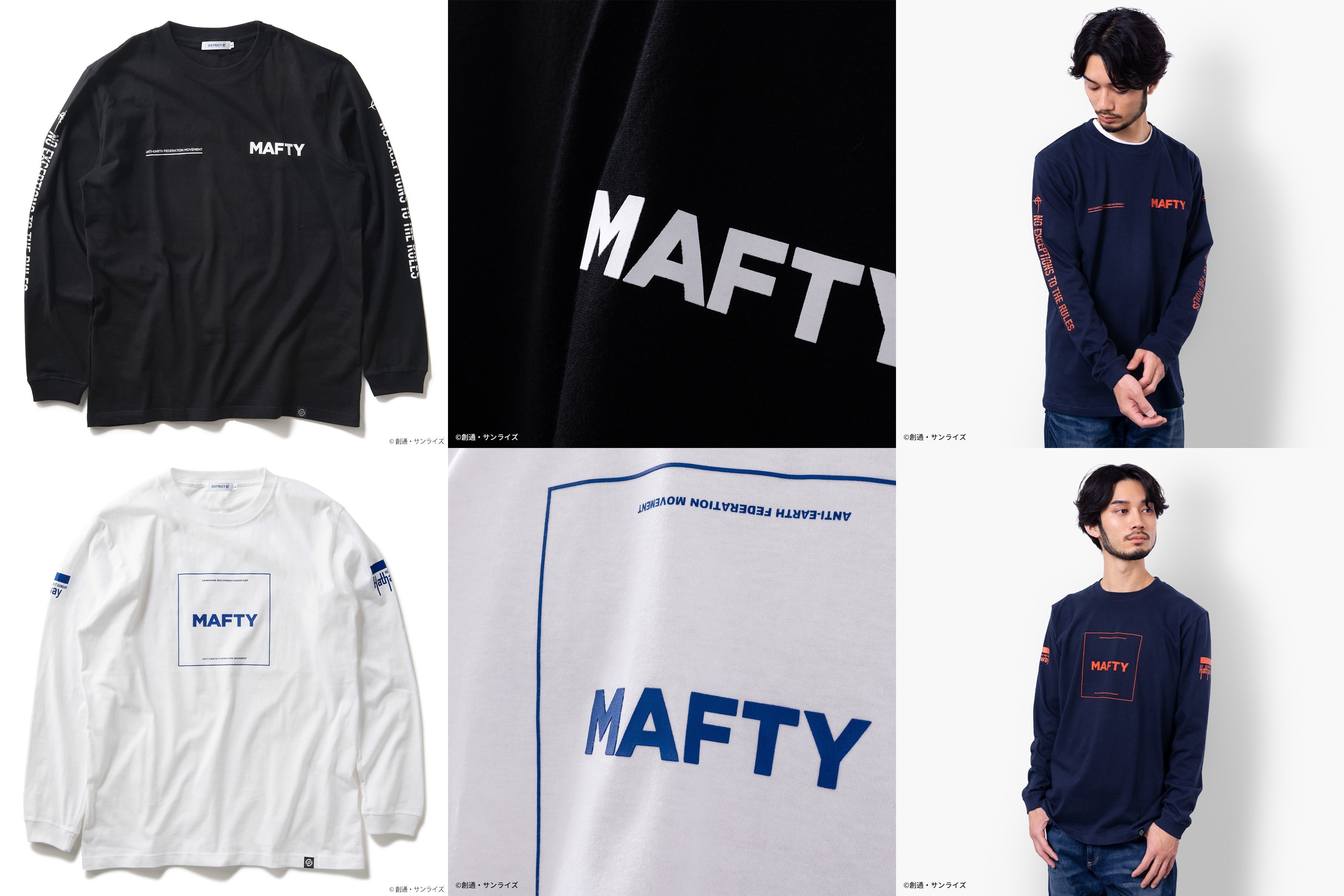 マフティーBOX柄は、バックプリントにMAFTYの文字をシンプルにBOXロゴに落とし込んだデザインで、メインのMAFTYの文字とロゴを囲むBOXは立体感のある厚盛プリントを施しています。両袖にはマフティーの衣装をイメージしたBOXをプリント、左胸にはマフティーマークのワンポイントをプリントしました。