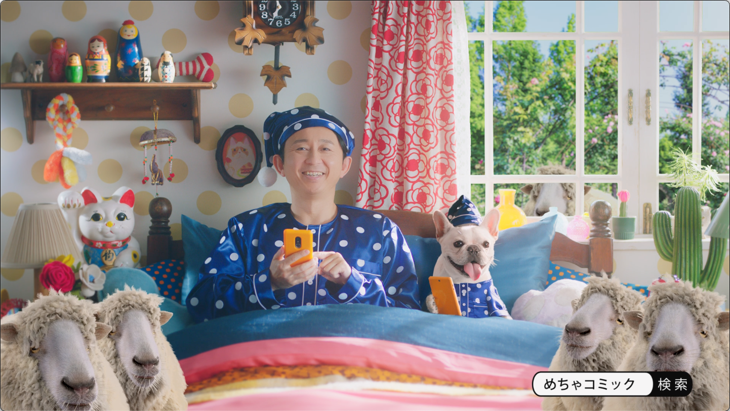 今回の「無料ひつじ篇」、「無料コミック篇」は、めちゃ犬のお家に泊まりにきた有吉さんが眠りにつく際のベッドで起きた、夢か現実かわからない不思議な出来事が描かれています。新たに登場したキャラクター「無料ひつじ」と、有吉さんとめちゃ犬のキュートなパジャマ姿は必見です。