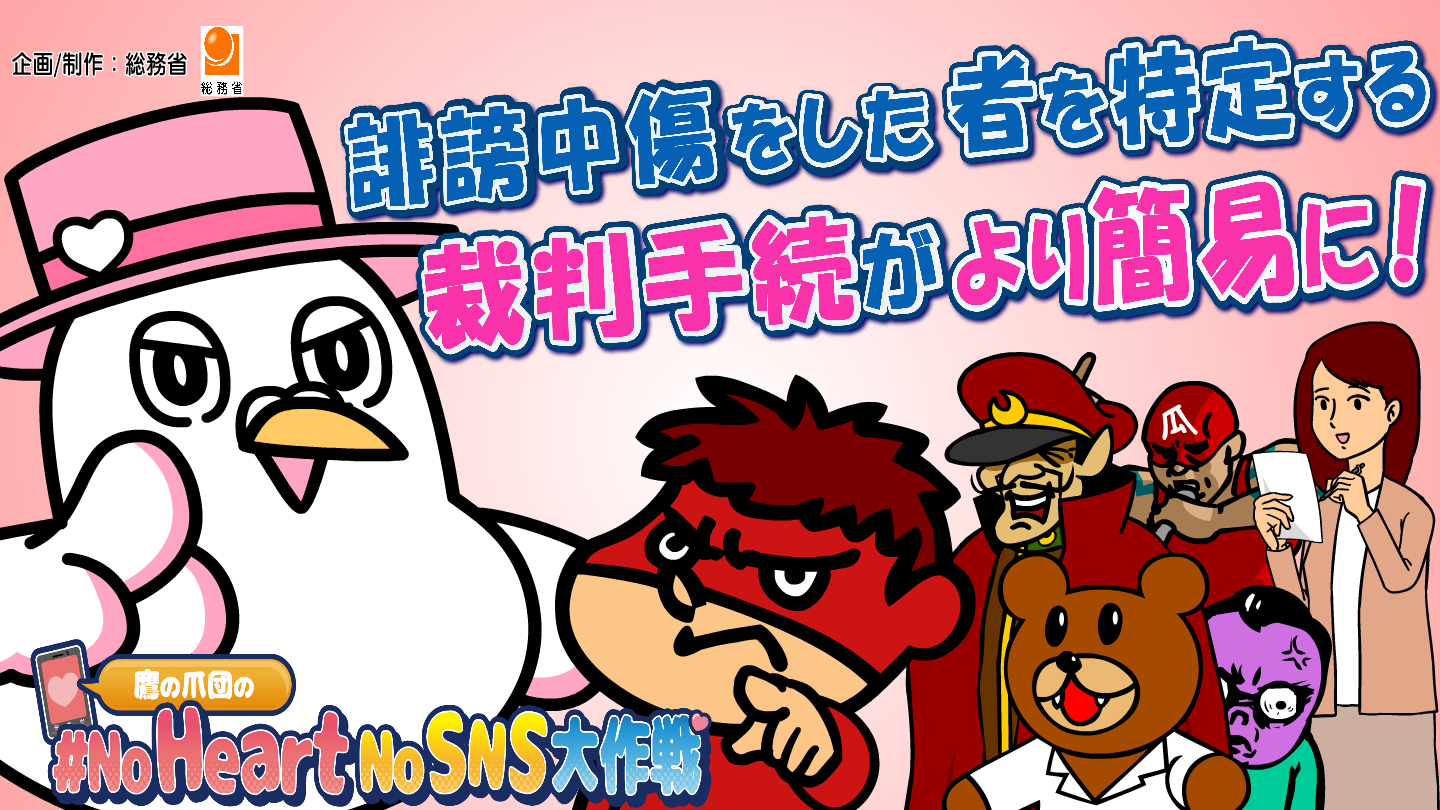 総務省では2020年7月より「#NoHeartNoSNS(ハートがなけりゃSNSじゃない!)」をスローガンに掲げ、誹謗中傷を未然に防ぐための知識や起きてしまったときの対処法、相談窓口の周知を目的として、啓発活動を行っています。