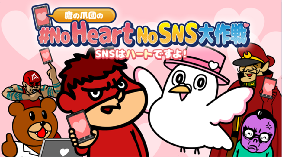 誰もが平和に暮らせる社会を目指して世界征服を企む悪の秘密結社 鷹の爪と、愛と平和に満ちた安心・安全なSNSライフの伝道師「ハートきゅん」が、SNSの平和を守るため、いま立ち上がる!