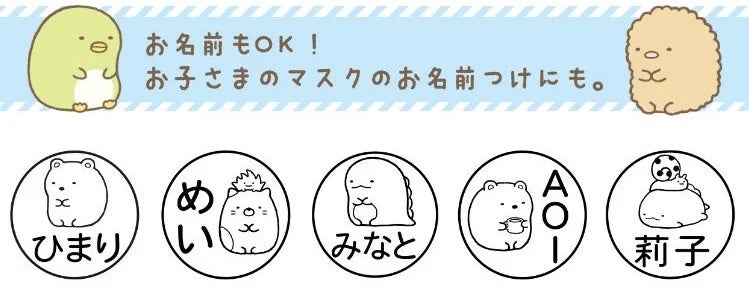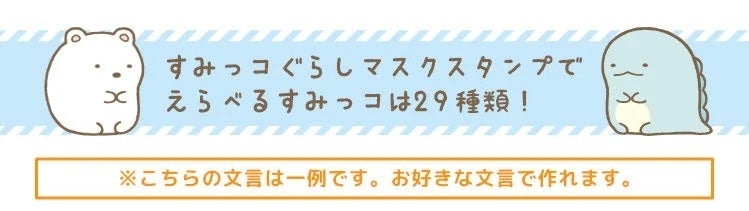 「すみっコぐらし マスクスタンプ」は、かわいらしいすみっコぐらしのキャラクターに好きな文字や名前を入れてつくる、すみっコぐらし好きにはたまらないオーダーメイドのマスクスタンプ。