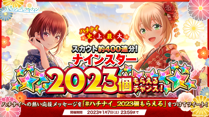 株式会社アカツキゲームス(本社:東京都品川区、代表取締役:戸塚佑貴、株式会社アカツキ100%子会社)は、当社より好評配信中のiOS/Android用アプリ『八月のシンデレラナイン(略称:ハチナイ)』において、本日2023年1月1日(日)より、新春2023キャンペーンを開催いたします。期間中、最大ナインスターが50個もらえるログインボーナスや、ハチナイ史上最大のナインスター2023個(スカウト400連分相当)がもらえるTwitterキャンペーンも実施いたします。また、URに覚醒できるSSR野崎夕姫(cv.南早紀)が新登場いたします。