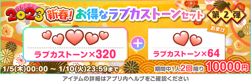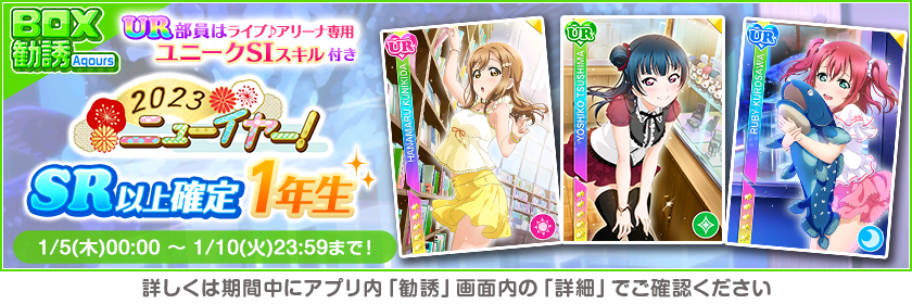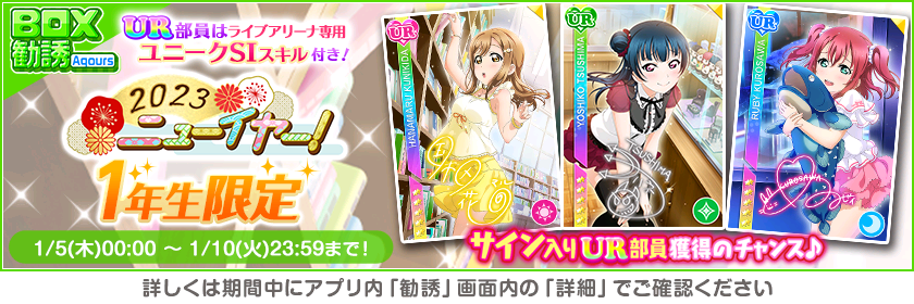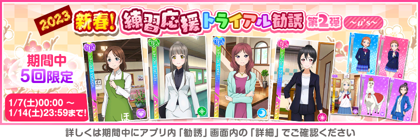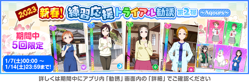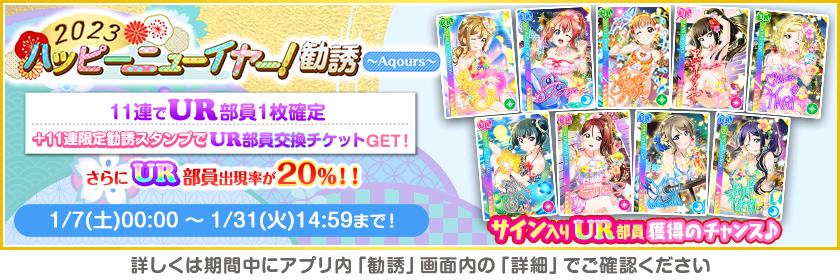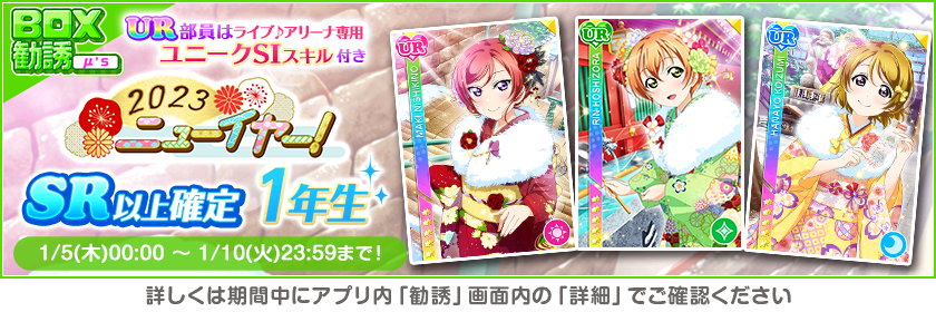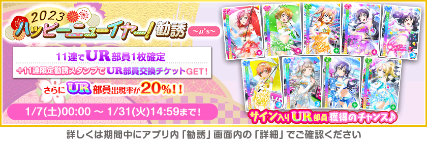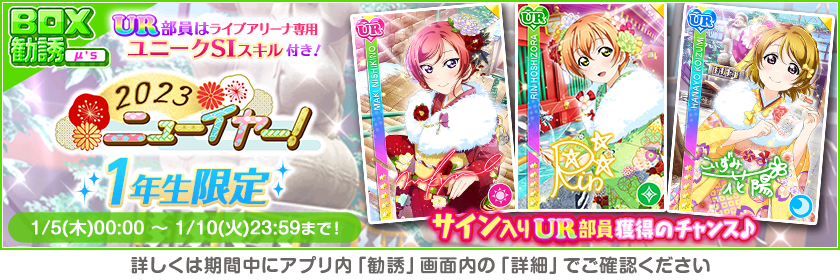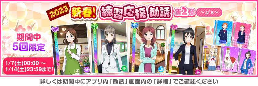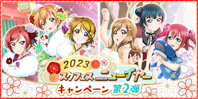 株式会社ブシロード(本社:東京都中野区、代表取締役社長:木谷高明)は、KLab株式会社(本社:東京都港区、代表取締役社長:森田英克)と共同開発いたしましたスマートフォン向けアプリ『ラブライブ!スクールアイドルフェスティバル』(以下、スクフェス) において2023スクフェスニューイヤーキャンペーン第2弾の開催をお知らせいたします。