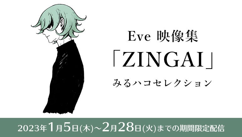 株式会社エクシングが展開する通信カラオケ「JOYSOUND」で、観て楽しめる多彩な映像コンテンツをお届けするサービス「みるハコ」に、Eveのミュージックビデオ集が登場!昨年12月に発売されたばかりのEve初の映像集「ZINGAI」から厳選された全9曲のMVを、本日1月5日(木)から2月28日(火)までの期間中、対象機種「JOYSOUND MAX GO」を導入のカラオケルームにて、無料(別途室料)でお楽しみいただけます。