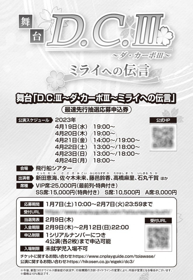 今月号の最速先行抽選応募申込シリアルでは、4月公演の「舞台「D.C.Ⅲ~ダ・カーポⅢ~ミライへの伝言」に申し込むことができます。