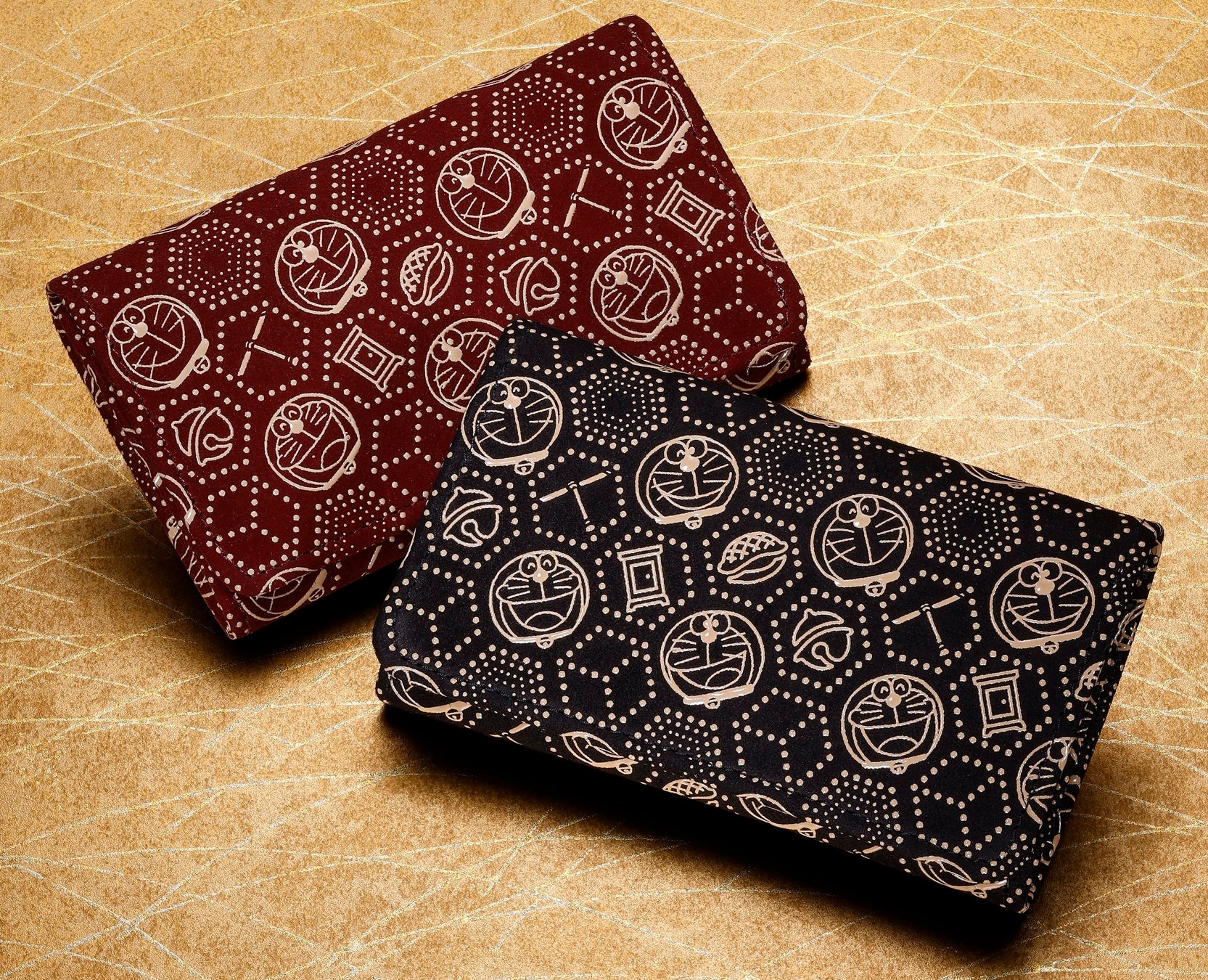 『ドラえもん』甲州印伝の二つ折り財布 ①墨 ②濃紫 『小学館百貨店』×印伝の山本 税込み価格各1万9800円