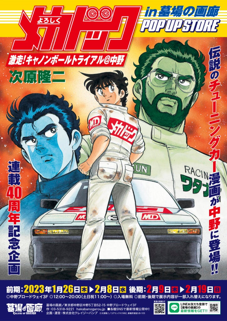 1月26日(木)~2月19日(日)の期間中は「墓場の画廊」にて80年代にカーマニアを熱狂させた伝説的レース漫画『よろしくメカドック』のPOP UP STOREを開催。題して、「よろしくメカドック展 ~激走! キャノンボールトライアル@中野~ in 墓場の画廊 POP UP STORE」!